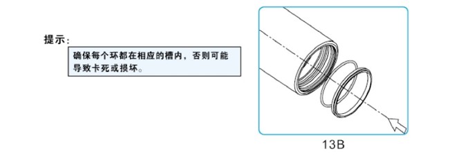 由導(dǎo)向帶開始,然后是油封和 O 型圈、防塵圈,切勿把油封裝反有油封溝槽的一面朝缸筒里側(cè)裝完油封和 O 型圈、防塵圈。